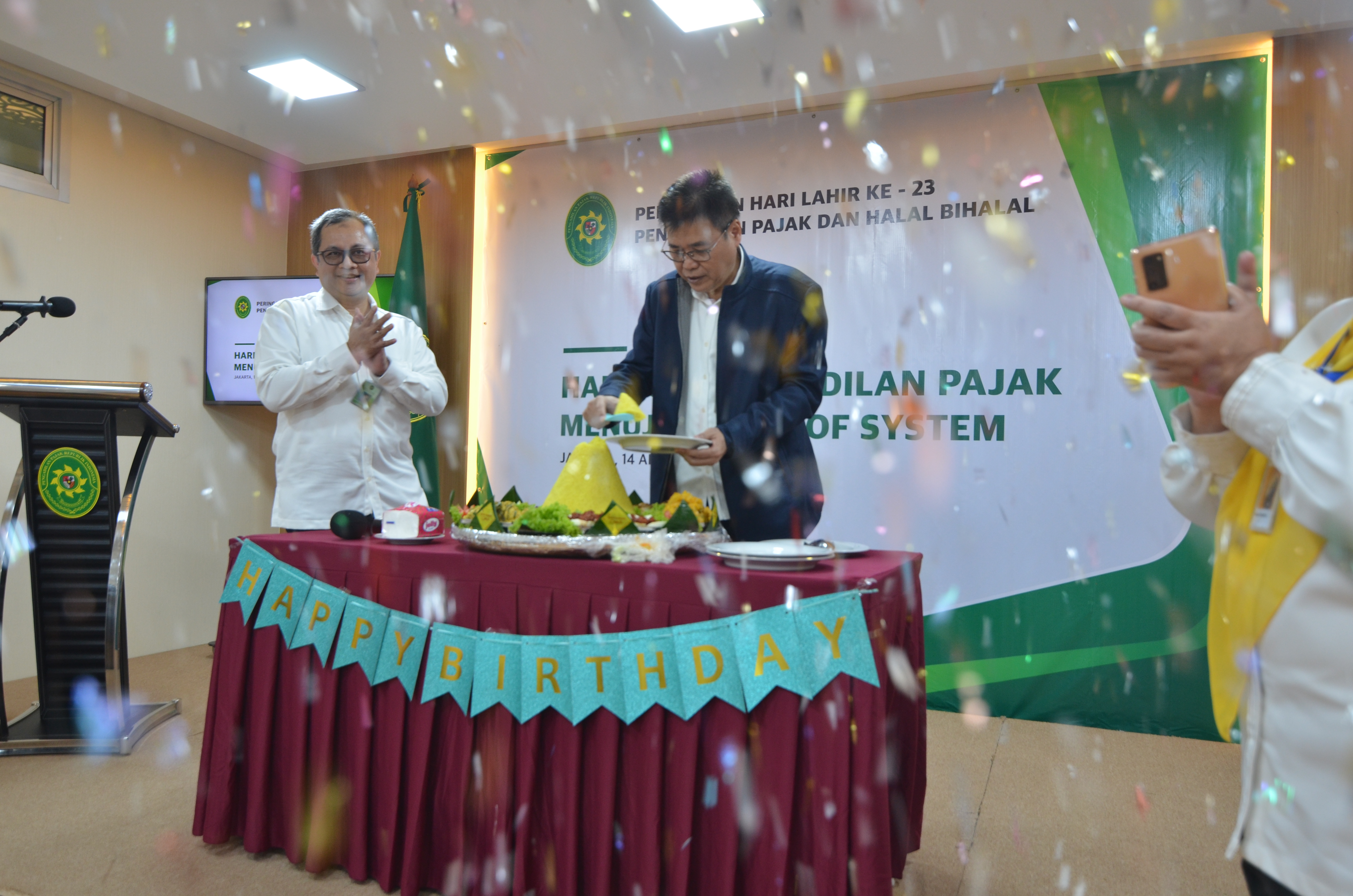 Sebagai wujud rasa syukur atas perjalanan panjang yang telah ditempuh oleh Pengadilan Pajak, dilakukan prosesi pemotongan dan penyerahan tumpeng oleh Ketua Pengadilan Pajak, Bapak Ali Hakim. Potongan tumpeng secara simbolis juga diberikan kepada perwakilan hakim dan pegawai yang masih aktif dan yang akan purna bakti sebagai bentuk penghormatan dan apresiasi atas dedikasi mereka selama ini.